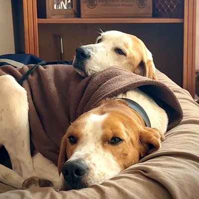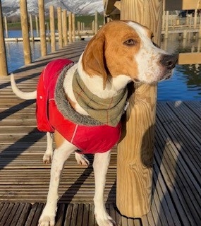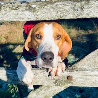 Joey gets on with the hounds and other dogs he lives with and meets when out on walks.